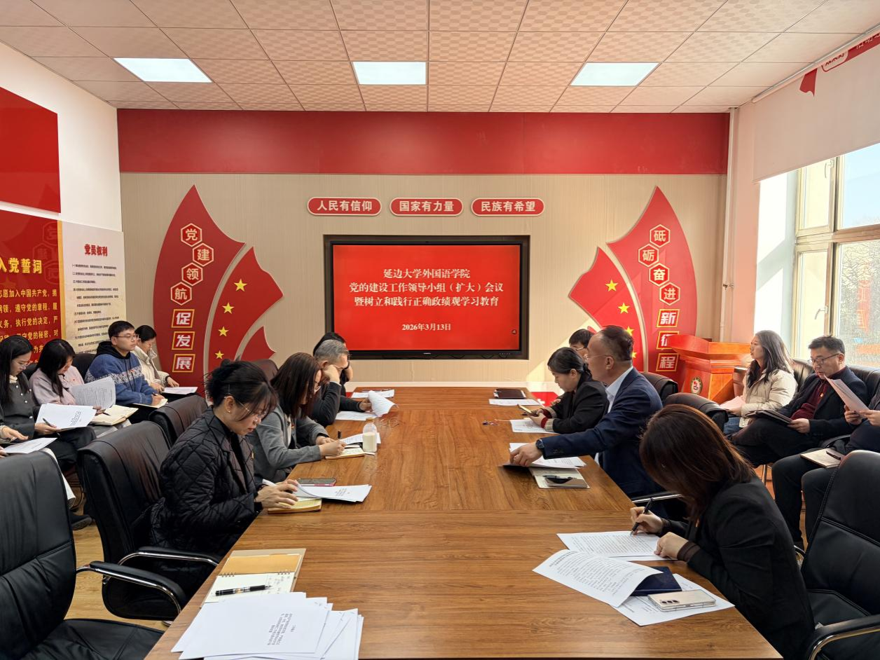 3月12日,延边大学外国语学院在融合楼204会议室召开党的建设工作领导小组(扩大)会议,开展树立和践行正确政绩观学习教育。学院党委书记徐炳煊主持会议并讲话,学院领导班子成员、党委委员、各基层党支部书记参加会议。